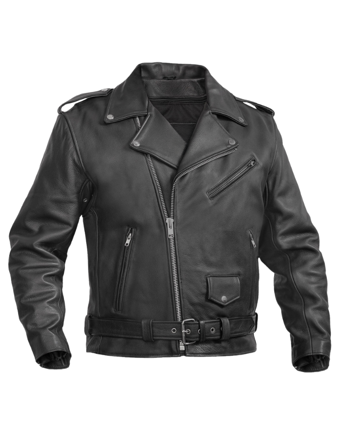 Timeless classic biker leather jacket by Calidad Originals with iconic detailing.